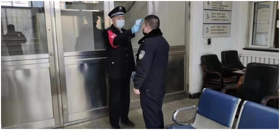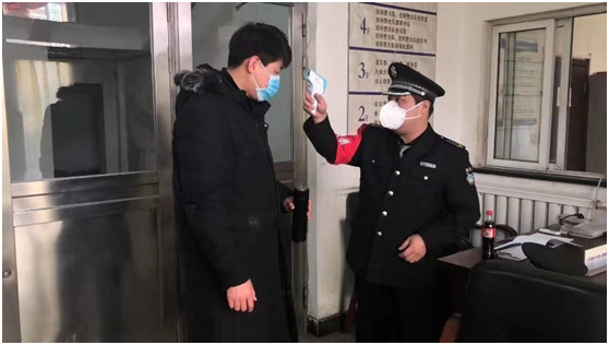 執(zhí)勤隊(duì)員正在給來訪人員測(cè)體溫